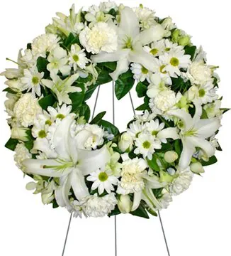 Lussuosa corona funebre di gigli o lilium, margherite o gerbere, garofani e fiori misti di stagione dai toni chiari e verde decorativo. Adatta per occasioni come lutto e funerale per esprimere cordoglio e porgere le vostre più sentite condoglianze alle persone care.