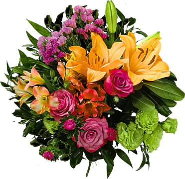 Questo mazzo di fiori combina l'eleganza dei gigli, la gioia delle alstroemerie e la passione delle rose. Perfetto per occasioni speciali, trasmette sentimenti profondi e crea un'atmosfera unica con la sua vibrante miscela di colori e fragranze. Ideale per sorprendere qualcuno di speciale.