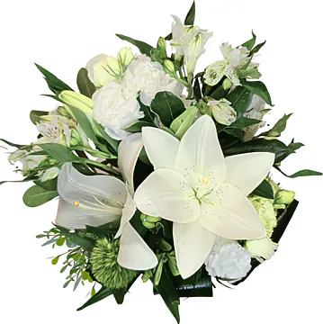 Questo mazzo bianco come la neve, battezzato "Purezza Nevosa", è una composizione floreale che evoca la serenità e la purezza del paesaggio invernale più idilliaco. Ogni elemento è stato accuratamente selezionato per creare una sinfonia di texture e sfumature, dove il bianco risplende nella sua massima espressione di eleganza e sofisticazione.