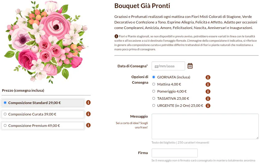 In questa fase è possibile scegliere la data di consegna e la fascia oraria, inoltre è possibile inserire un messaggio da allegare al mazzo di fiori; se sei a corto di idee tanti i messaggi già disponibili per ogni occasione da utilizzare così come sono oppure da modificare secondo la tua esigenza.