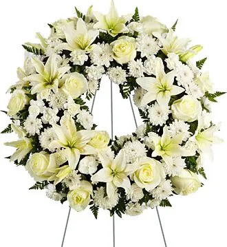 Lussuosa corona funebre di rose, gigli o lilium, crisantemi e fiori misti di stagione dai toni chiari e verde decorativo. Adatta per occasioni come lutto e funerale per esprimere cordoglio e porgere le vostre più sentite condoglianze alle persone care.