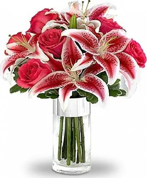 Rose Rosse Big e Lilium con Verde Decorativo di Stagione in Elegante Confezione a tono. Esprime amore, allegria e felicità. Adatto per occasioni come nascita, amore, felicitazioni, compleanni, matrimoni, anniversari e inaugurazioni.