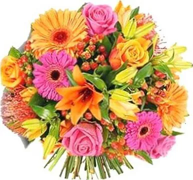 Bouquet di Fiori Misti stagionali dai toni accesi arancio e rosa confezionato con verde decorativo. Esprime amore, allegria e felicità. Adatto per occasioni come nascita, amore, felicitazioni, compleanni e amicizia.